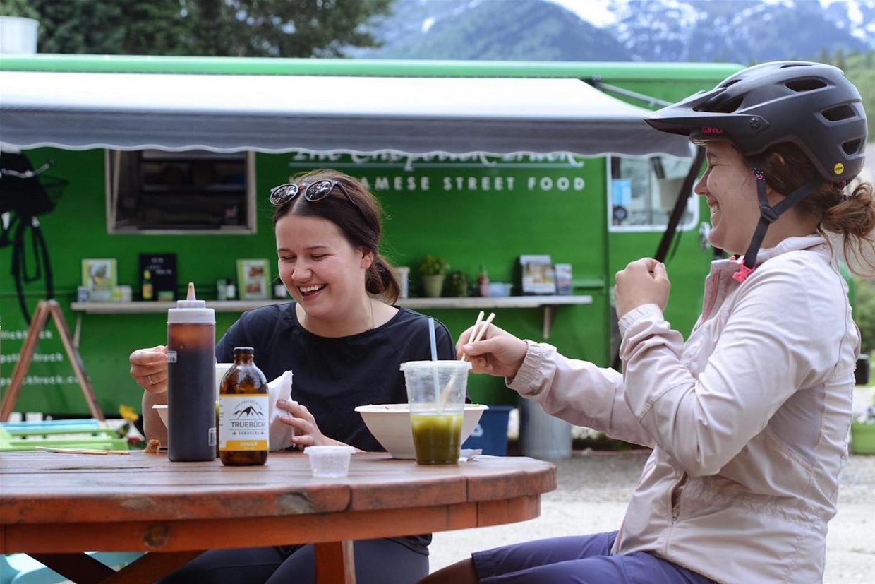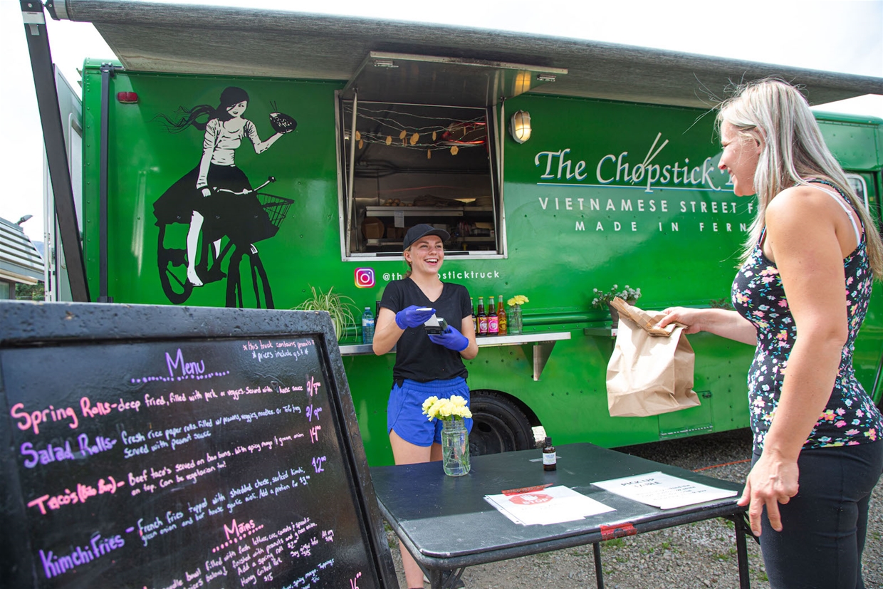 The Chopstick Truck serves up a creative menu of Vietnamese-inspired street food including summer rolls, bao bun tacos, vermicelli bowls, subs, and a Fernie T-wrap specialty. Beverages include authentic bubble tea, Vietnamese iced coffee, and True Buch Kombucha.